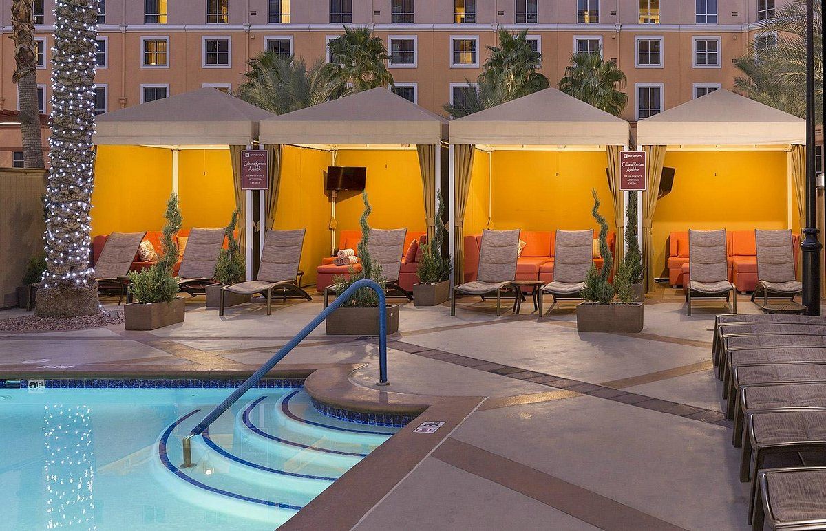 Wyndham Grand Desert offers multiple outdoor pools and hot tubs, perfect for relaxation and family fun under the Las Vegas sun. The poolside lounge area provides a serene escape for guests.